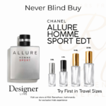A fresh and energetic luxury fragrance from Chanel. Chanel Allure Homme Sport blends citrus brightness with creamy smoothness and clean woods, creating a sporty yet elegant signature scent. Available in authentic Chanel decants at Redolence Nepal.
